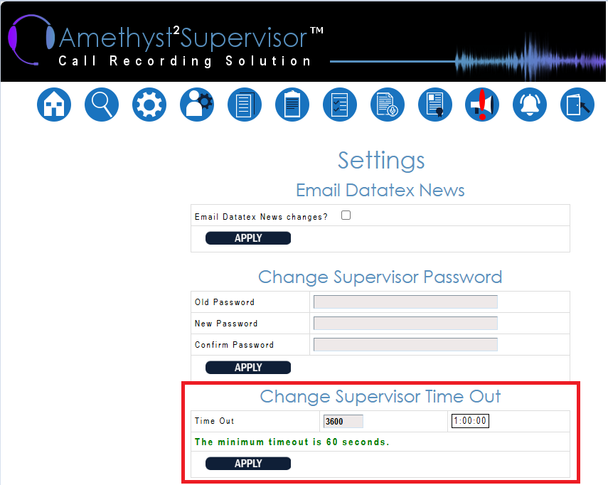 - Update the idle time out setting under ‘Change Supervisor Time Out’ and APPLY.