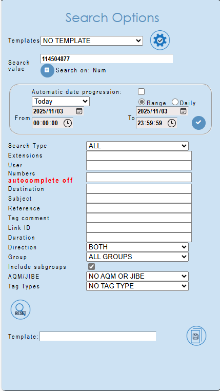 When searching for a phone number and date range: